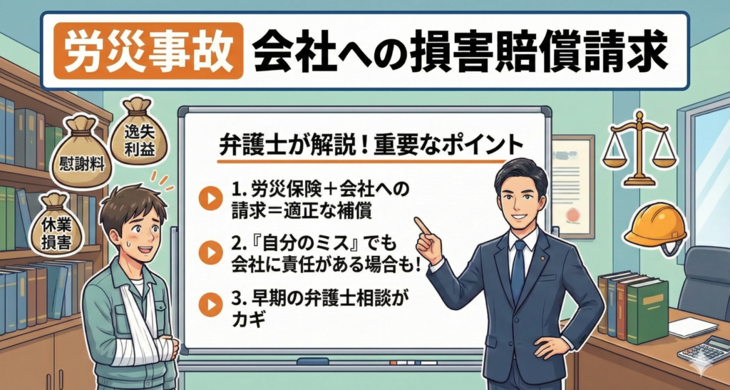 労災事故で会社への損害賠償請求について、重要なポイントを改めて整理してみましょう。