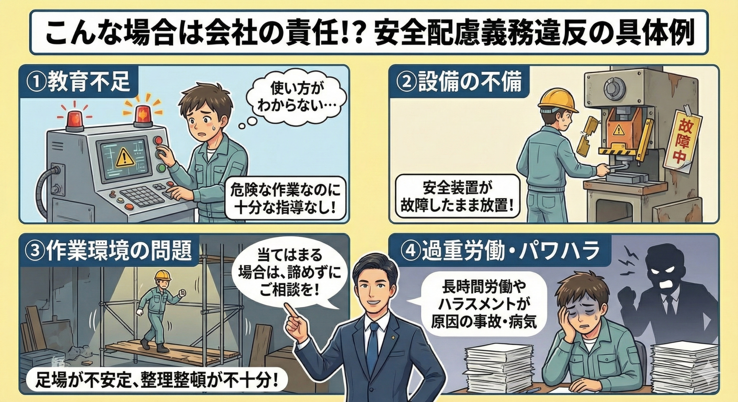 会社が管理する職場で、会社が提供した機械や道具に不備があって事故が起きた場合も、安全配慮義務違反が認められやすいケースです。古い機械の継続使用、メンテナンス不足、安全装置の未設置や故障などが該当します。