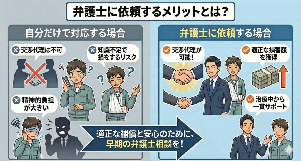 このため、労災により怪我をされた場合は、弁護士に依頼し、代理人として交渉を行ってもらうことをお勧めします。