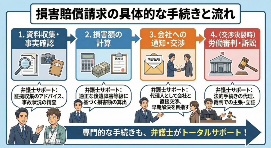 会社に対して損害賠償請求が可能だと判断した場合、実際にはどのような手続きを踏んで進めていくのでしょうか。ここでは、具体的な流れを順を追って説明していきます。