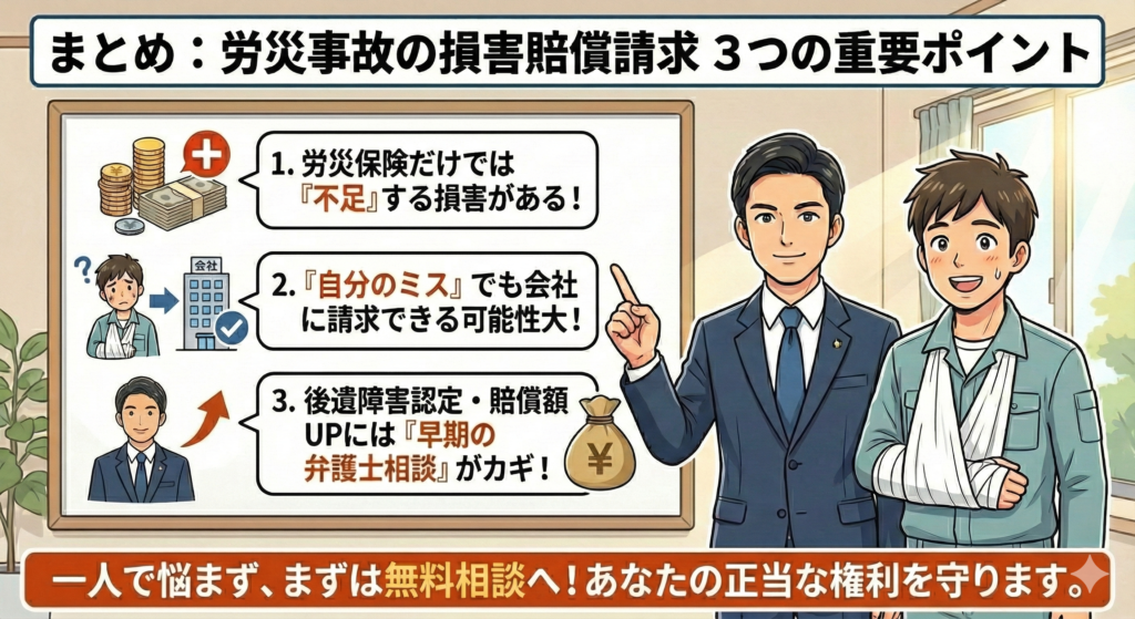 そして最も重要なのは、早期の弁護士相談です。労災事故の損害賠償請求は専門性が高く、治療中の段階から適切なアドバイスを受けることで、後遺障害等級認定や損害賠償額に大きな差が生まれることがあります。