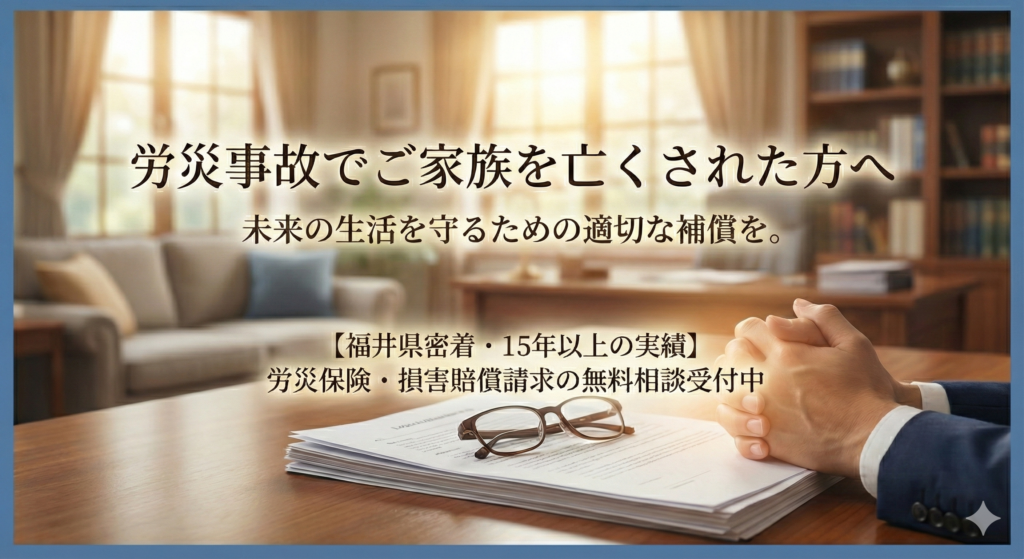 私は福井県で15年以上にわたり弁護士として活動し、数多くの労災事故のご相談をお受けしてきました。その中でも、ご家族を亡くされたご遺族の方々とお話しする際は、その深い悲しみと将来への不安を目の当たりにし、法律家として何ができるかを常に考えてきました。特に一家の大黒柱を失われたご家族の経済的な不安は切実で、適切な補償を受けることが今後の生活の安定に直結することを痛感しています。